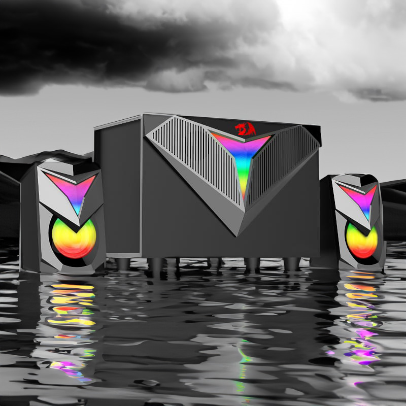 The Redragon 11W Toccata RGB 2.1 PC Gaming Speaker Set offers great sound with deep bass and colourful RGB backlighting effects. Its unique futuristic design is great for the gamer who wants to make a statement with both the sound and in terms of looks. It features 2 x 3W speakers and a 5W subwoofer for bass. It comes with a volume and bass control knob, a power switch as well as a switch for the LED lighting. The speakers are powered via USB which can be plugged directly into the subwoofer. The subwoofer itself is great for adding that additional bass to your gaming, movies or music.