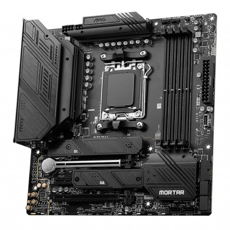 MSI lightning Gen 4 PCI-E represents the bandwidth of an x16 interface to 64GB/s which has doubled compared to its previous generation. MSI PCI Express Steel Armor slots are secured to the motherboard with extra solder points and support the weight of heavy graphics cards. When every advantage in games counts, Steel Armor shields the point of contact from electromagnetic interference. A huge step of DDR performance enhancement with the latest DDR5 memory. By combining a dedicated SMT welding process and MSI Memory Boost technology, the MSI MAG B650M MORTAR WIFI is ready to deliver the world-class memory performance